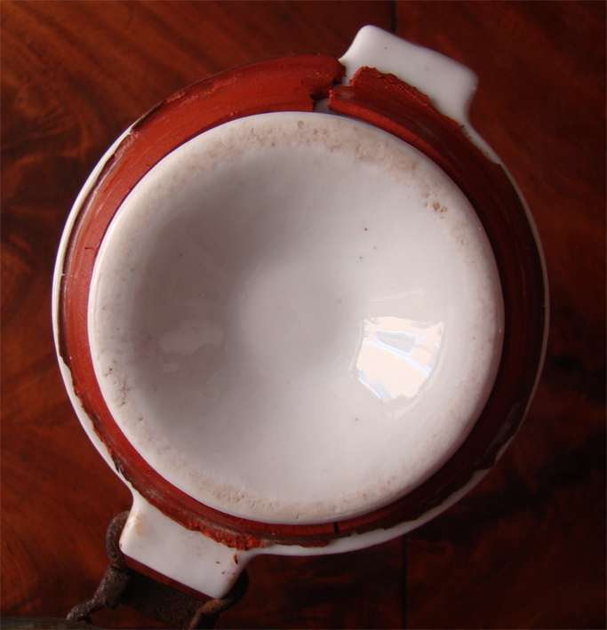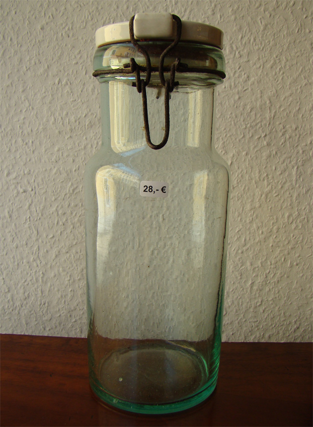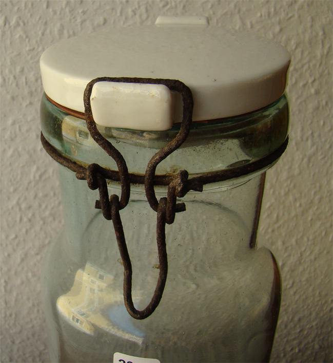 antike Glasflasche mit Porzellandeckel (mundgeblasen) um 1900 mit Striemen und Lufteinschlüssen ORIGINAL, alt / Größe : ca. 27,5cm hoch und Durchmesser ca. 10,8cm Mit altersbedingten Gebrauchsspuren! Zustand siehe nachfolgende Bilder! Der Gummi am Porzellandeckel ist beschädigt! Der Draht ist stark rostig und am Glas sind Kratzer! ![]() Der Draht ist stark rostig! ![]() Der Gummi am Porzellandeckel ist beschädigt! ![]() mit Striemen, Lufteinschlüssen und Kratzern ![]() |