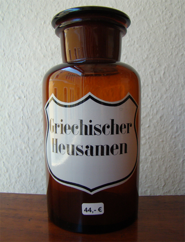 antike Glasflasche für griechische Heusamen, Apothekenflasche, von ca. 1900-1920